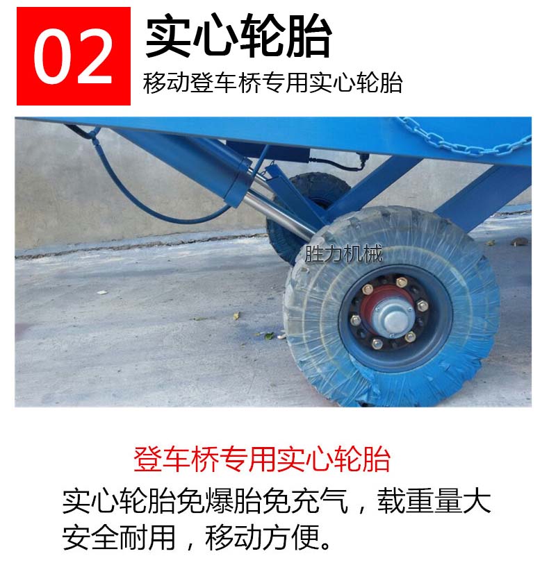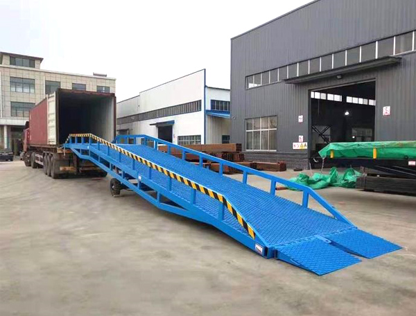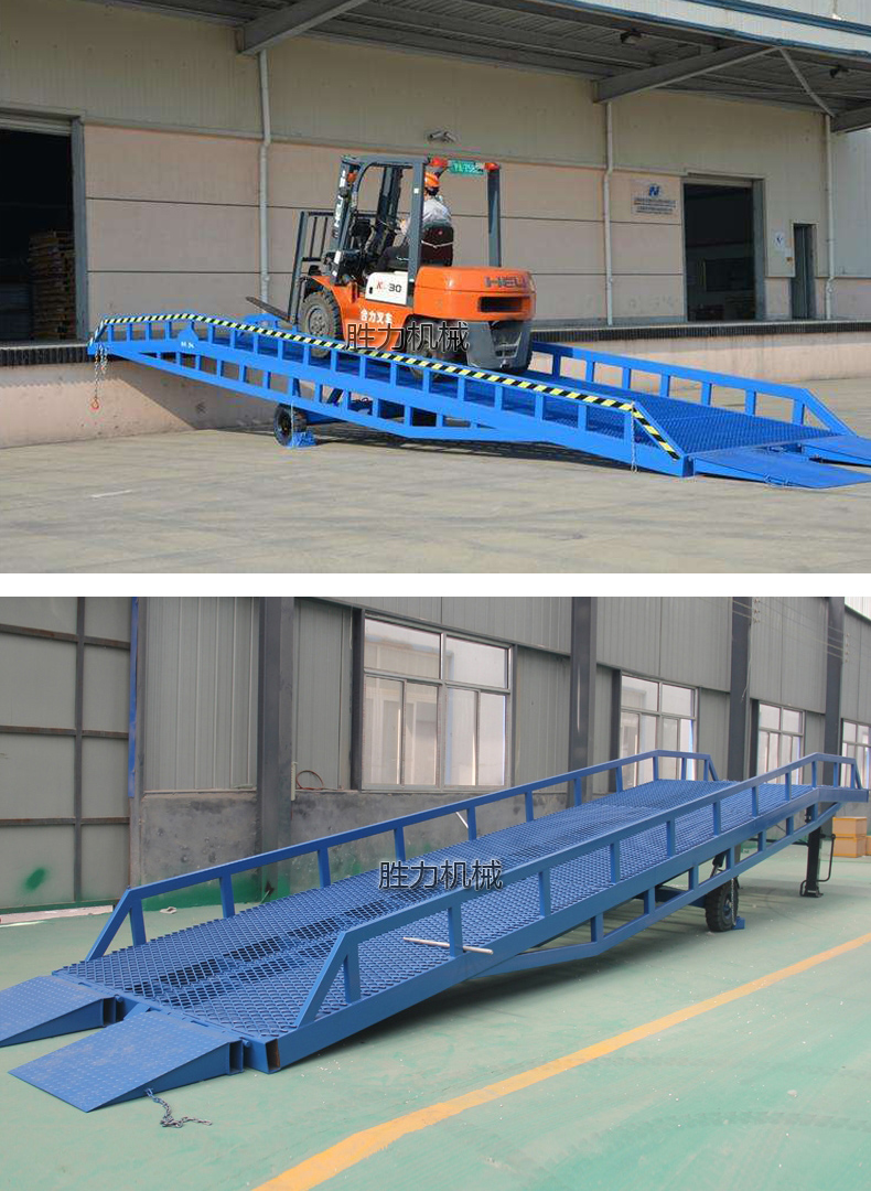 移动登车桥也被称作叉车装卸专用平台,是装卸货物的专用液压设备,设备带有移动轮,可随时移动到装卸地点。移动登车桥根据额定载重量可分为6吨、8吨、10吨、12吨、15吨,设备总长11米,带有坡度,叉车等搬运车辆可通过移动登车桥的坡度和高度直接驶入货车内部进行装卸货物作业,在提高装卸作业效率的同时又能充分保障作业安全。移动登车桥无需外接电源,可通过手压泵做动力进行能设备高度的调整,可以充分适应各种不同高度的货车。移动登车桥加快装卸货物的速度,减少劳动力,为企业获取更大的经济效益。